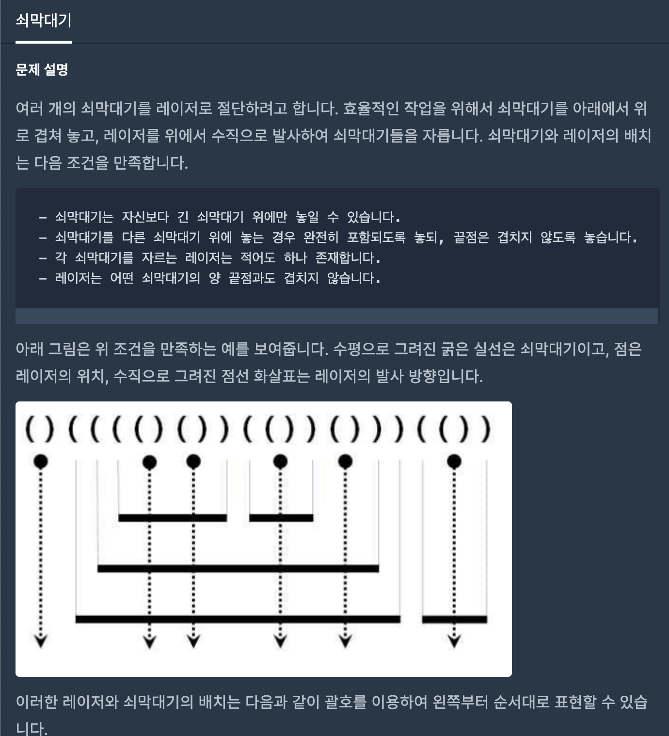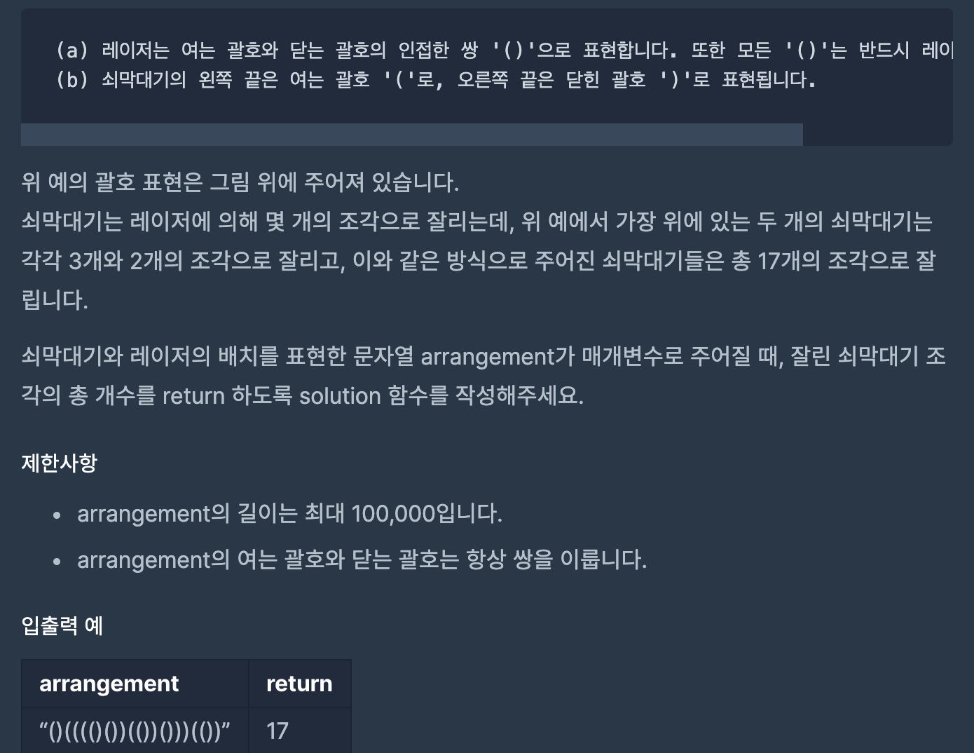 따라서 레이저를 만났을때 아직 (를 만나지 않은 )의 개수가 잘린 막대기의 개수가 된다.