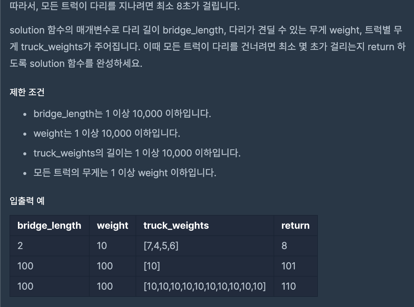 public int solution(int bridge_length, int weight, int[] truck_weights) {
