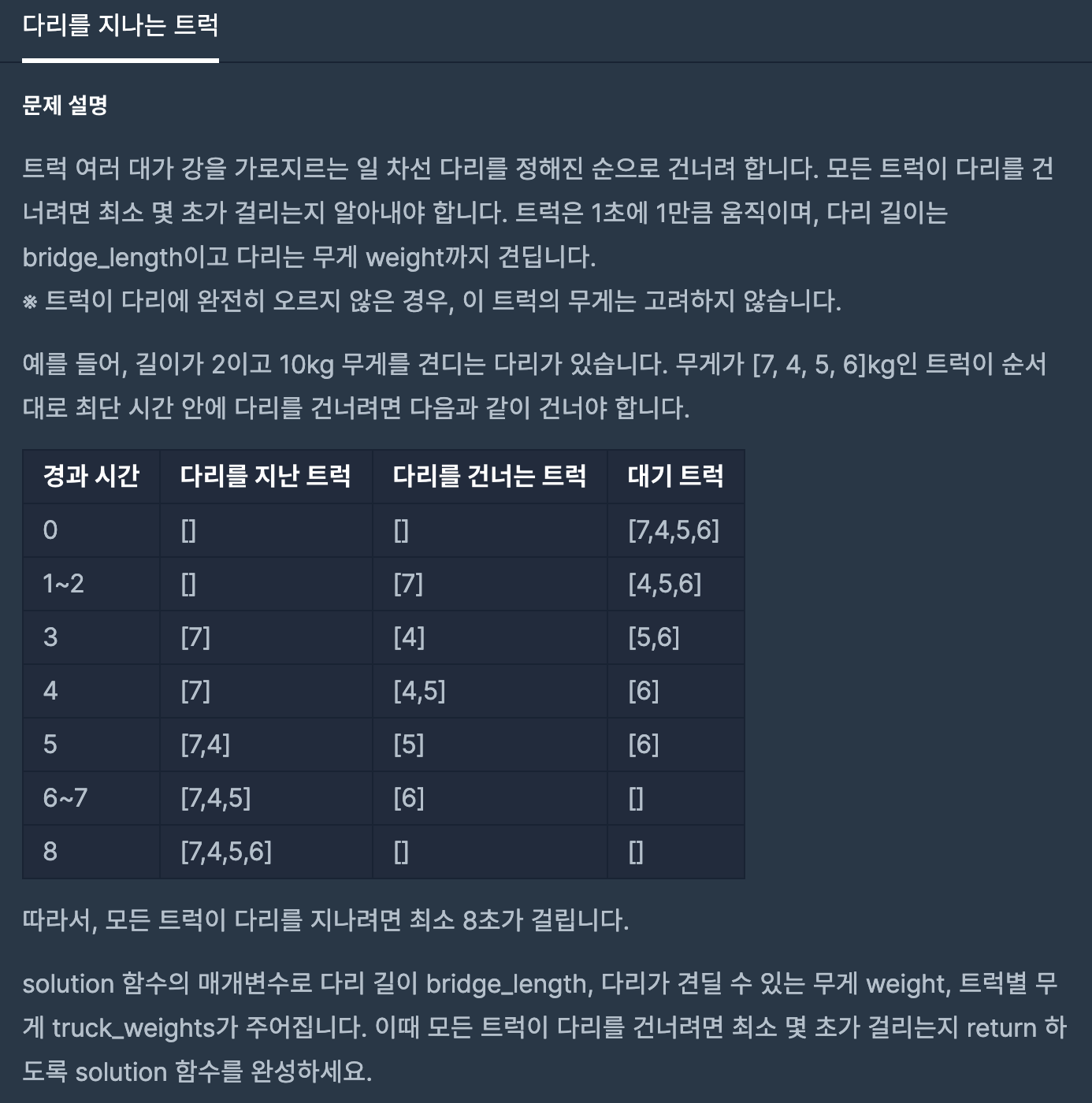 다리에 올라와 있는 트럭이 몇대인지 모르는 상황이다. 이 때 다리에 올라와 있는 트럭 모두에게 index값(다리에 올라오고 지난 시간)을 계속 더해줄 수 있어야 하는데 Queue로는 할 수 없었다.