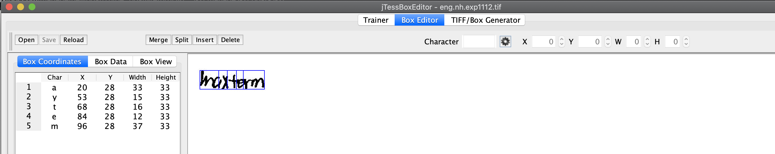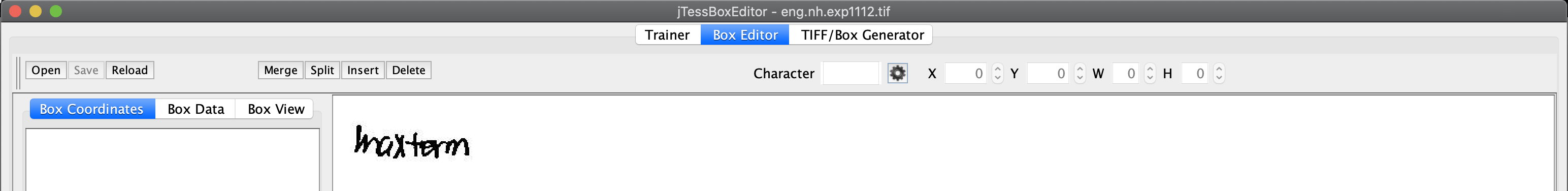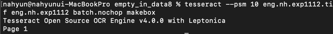 tesseract --psm 10 eng.nh.exp1112.tif eng.nh.exp1112 batch.nochop makebox