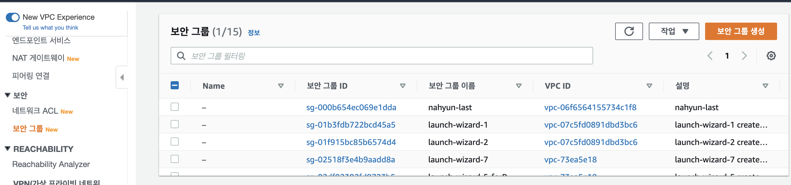 [VPC -> 보안그룹 -> 보안그룹 생성]