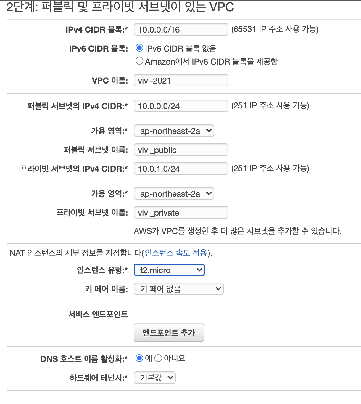 오른쪽의 대신 NAT인스턴스를 사용하기를 누르면 위와 같은 페이지를 볼 수 있고 t2.micro로 설정해주었다.