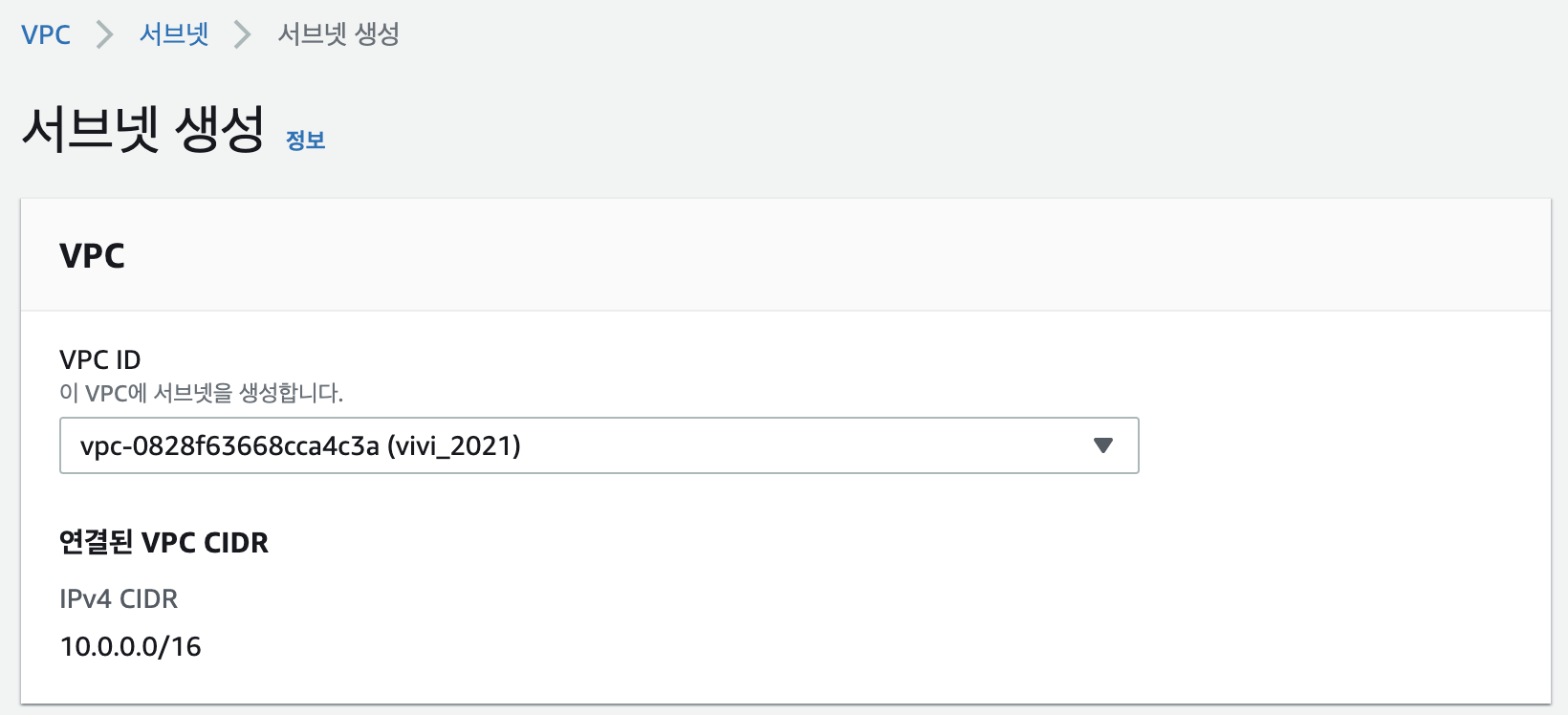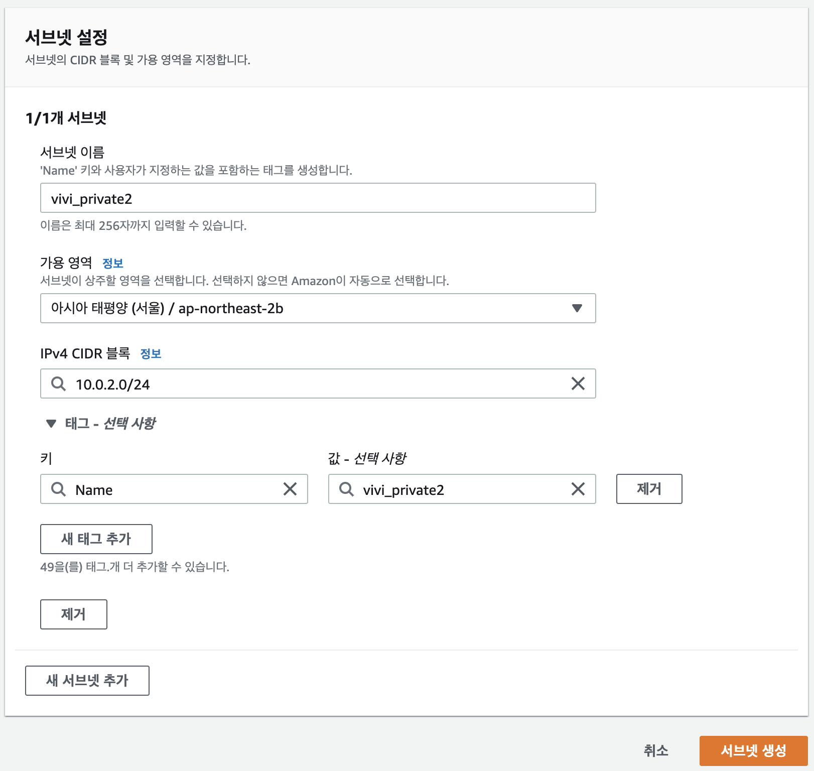 이전의 서브넷에서는 10.0.1.0/24로 연결해줬으니 이번에는 10.0.2.0/24로 연결해주자.