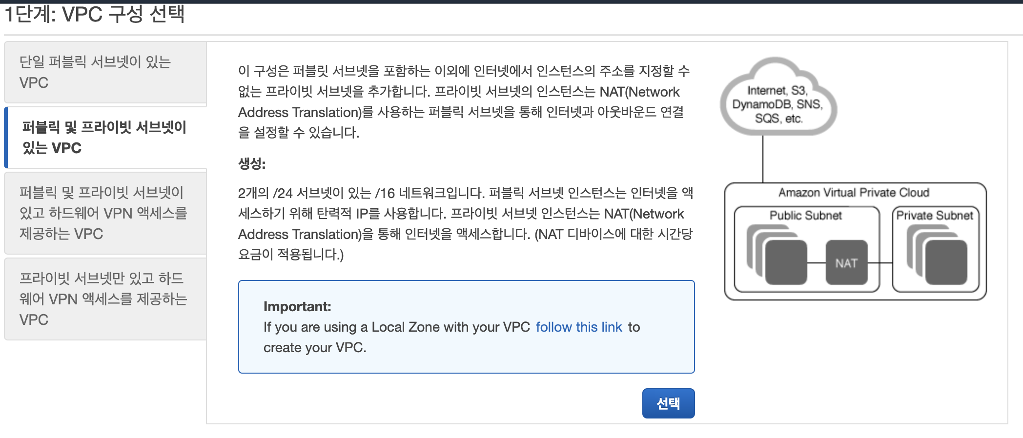1단계에서 [퍼블릭 및 프라이빗 서브넷이 있는 VPC]를 선택해주자. public subnet으로만 private subnet으로 접근이 가능할 것이다.