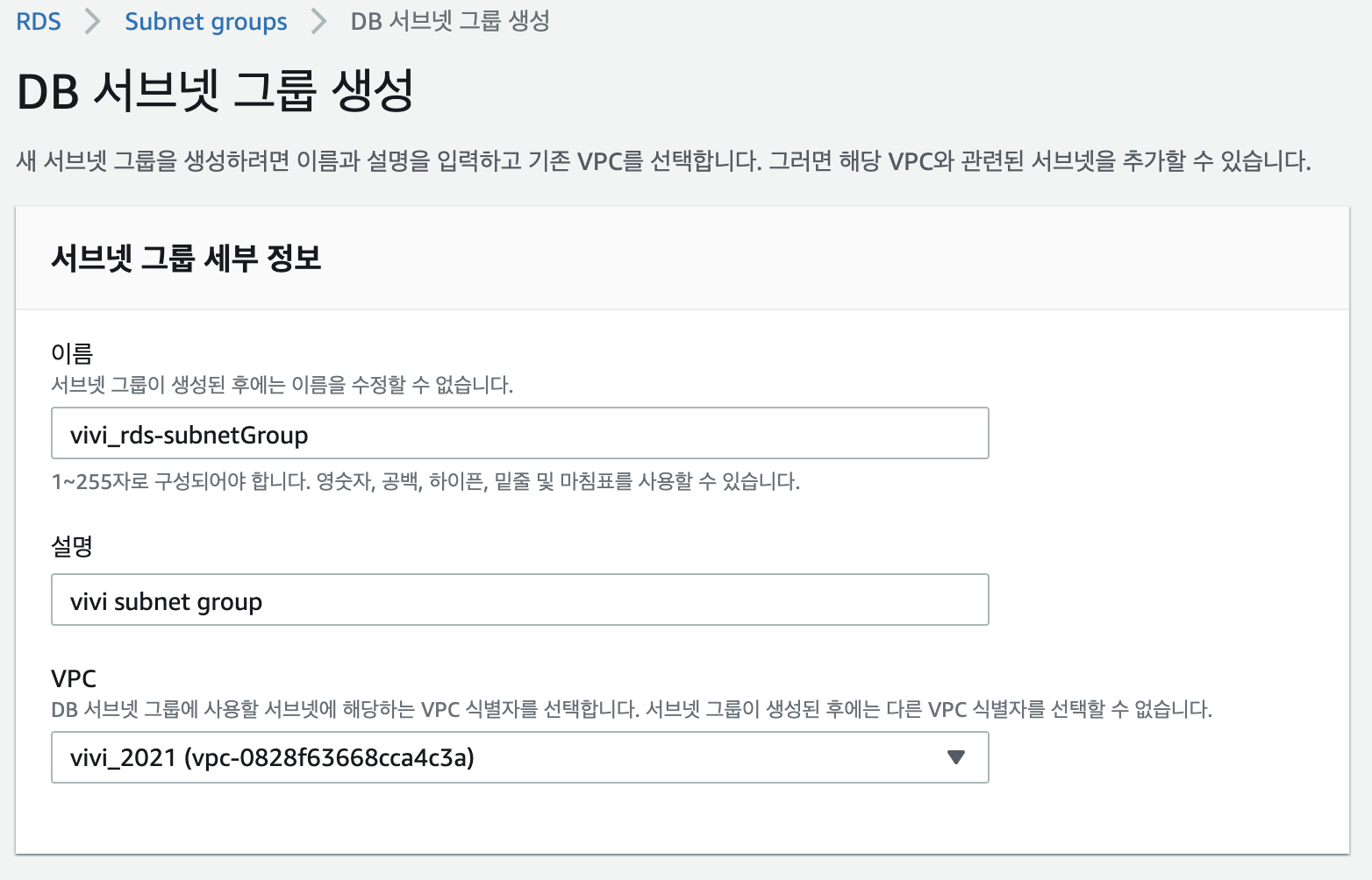 [RDS -> 서브넷 그룹 -> DB 서브넷 그룹 생성]