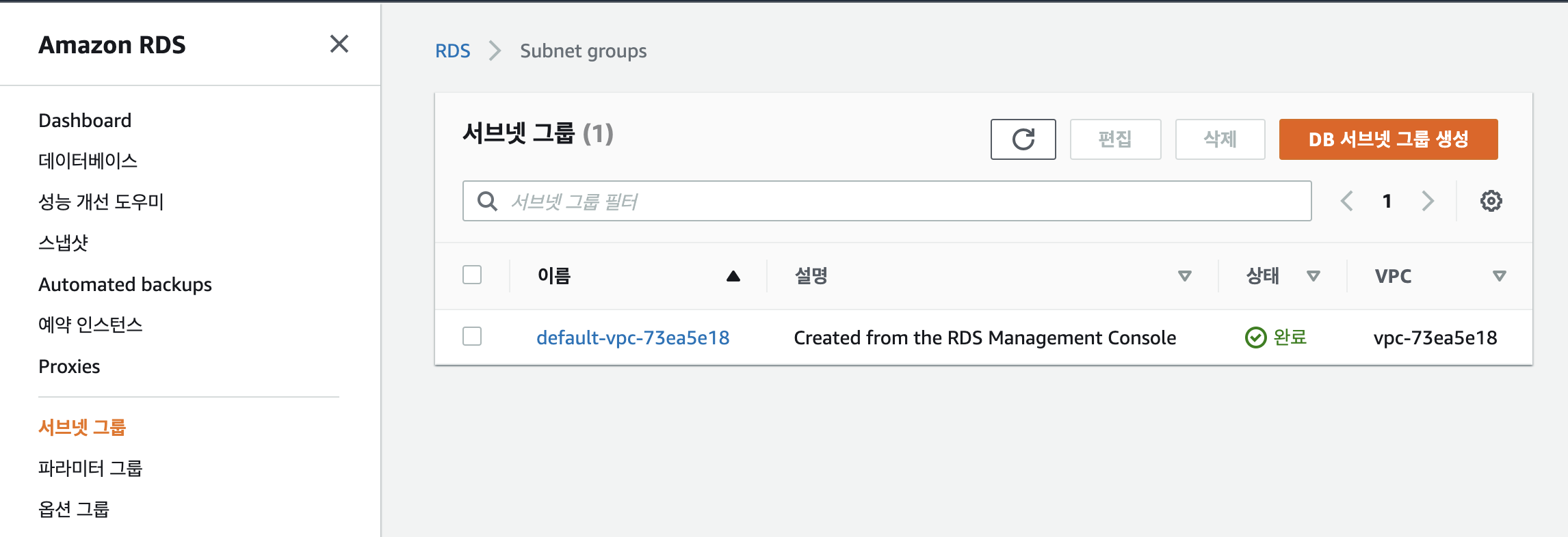 사용자가 VPC에서 만든 다음 DBinstance에 대해 지정하는 subnet을 모아두는 작업이다.