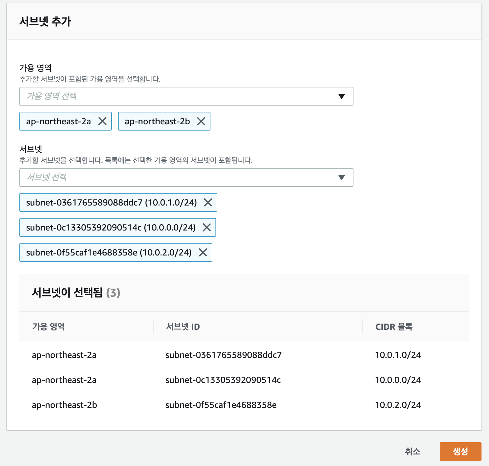 이전 과정에서 생성했던 VPC와 서브넷들을 선택해주고 이들을 설정했던 가용영역을 선택해준다.