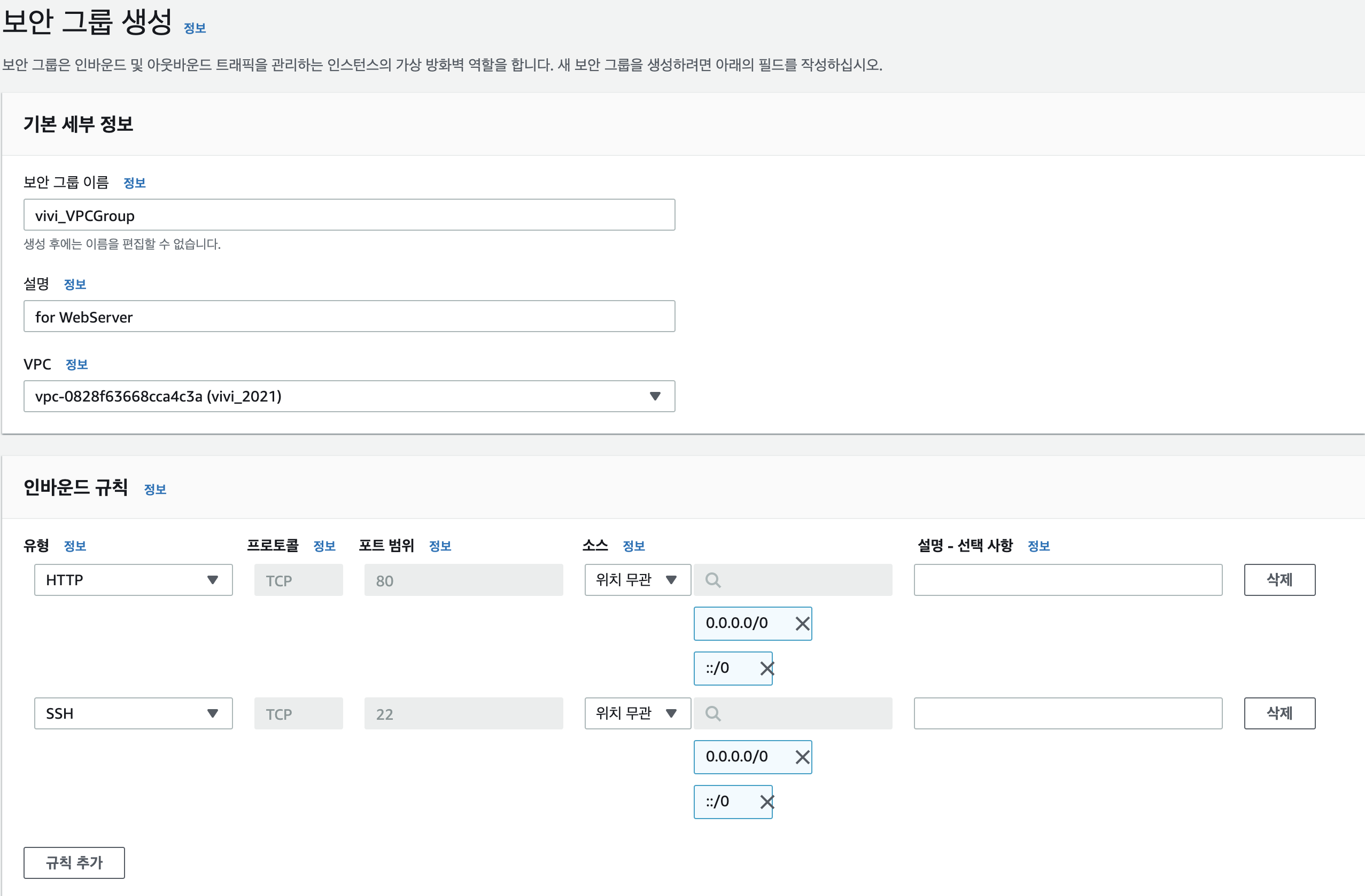Webserver를 위한 보안 그룹이기 때문에 처음에 생성했던 VPC를 설정해준다.