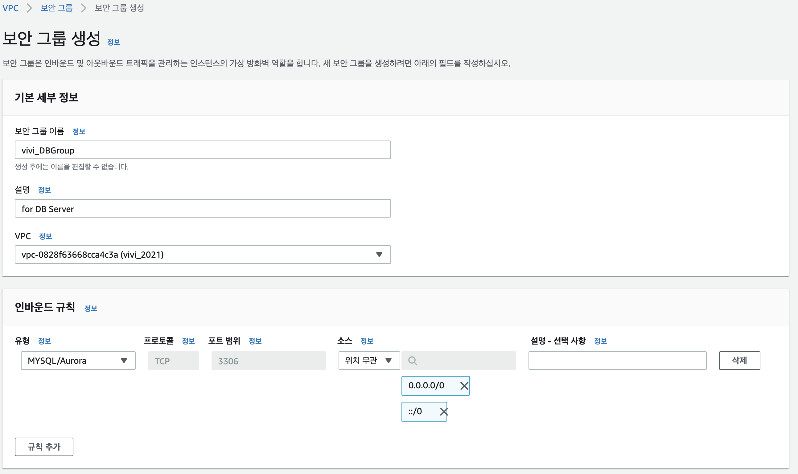 같은 방식으로 MySQL subnet 보안그룹도 설정해주자