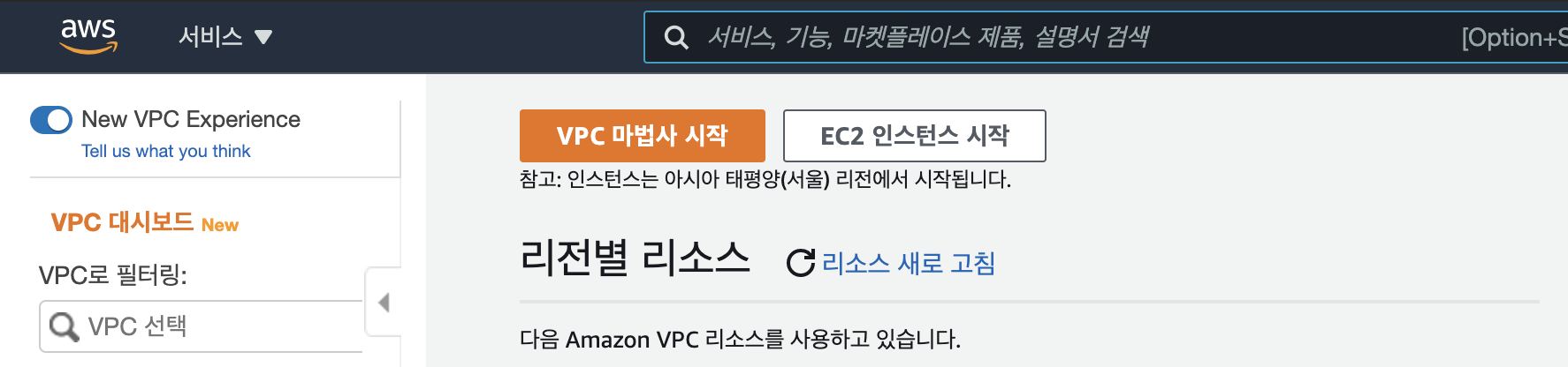 먼저 VPC대시보드에서 VPC마법사 시작을 통해 VPC를 생성할 것이다. (VPC마법사 시작은 VPC대시보드에서만 가능하다)