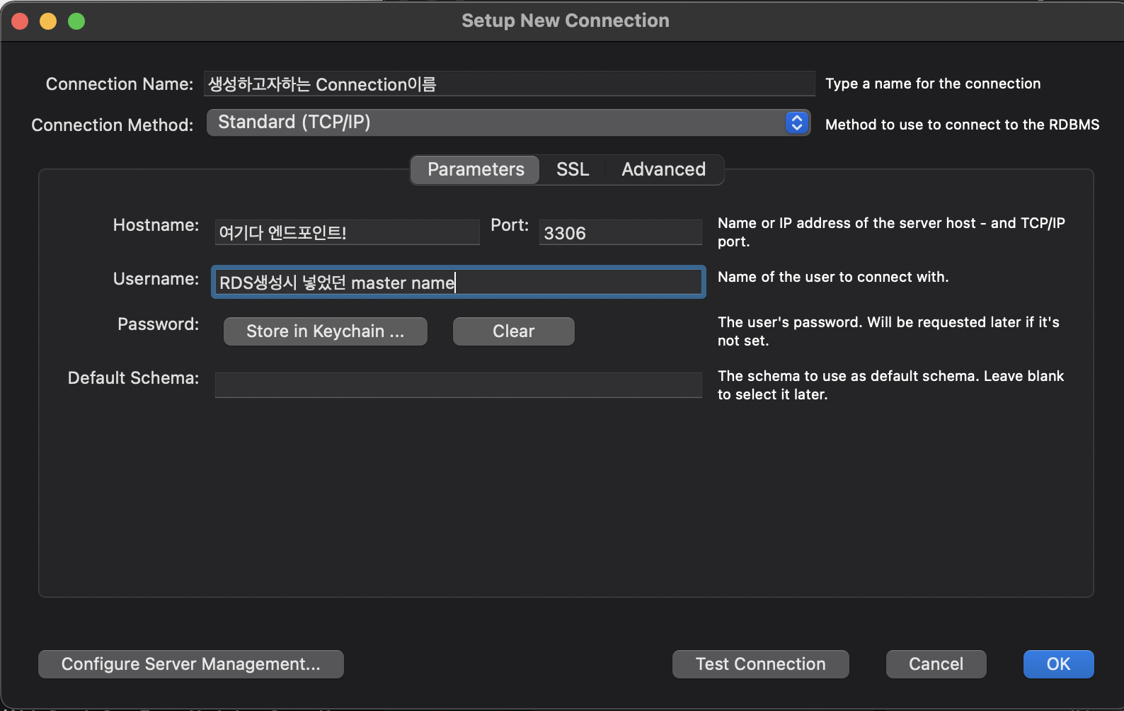 MySQL Hostname: 데이터베이스 엔드포인트를 넣어주면 된다.
