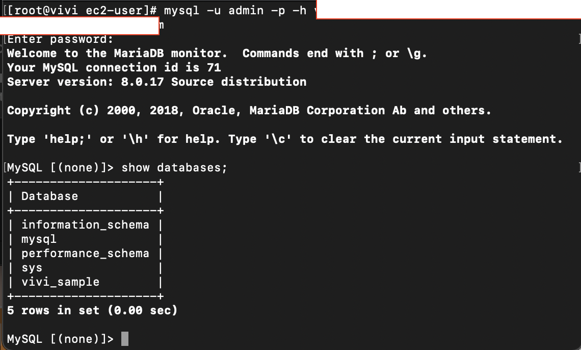 그리고 RDS설정할 때 만들었던 초기 데이터베이스 vivi_sample도 잘 뜬다!!!!!!!!!!!!!!!!!!!!!!!!!!!!!