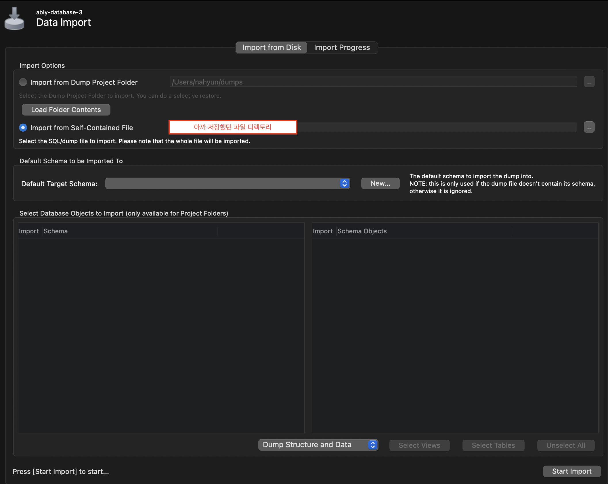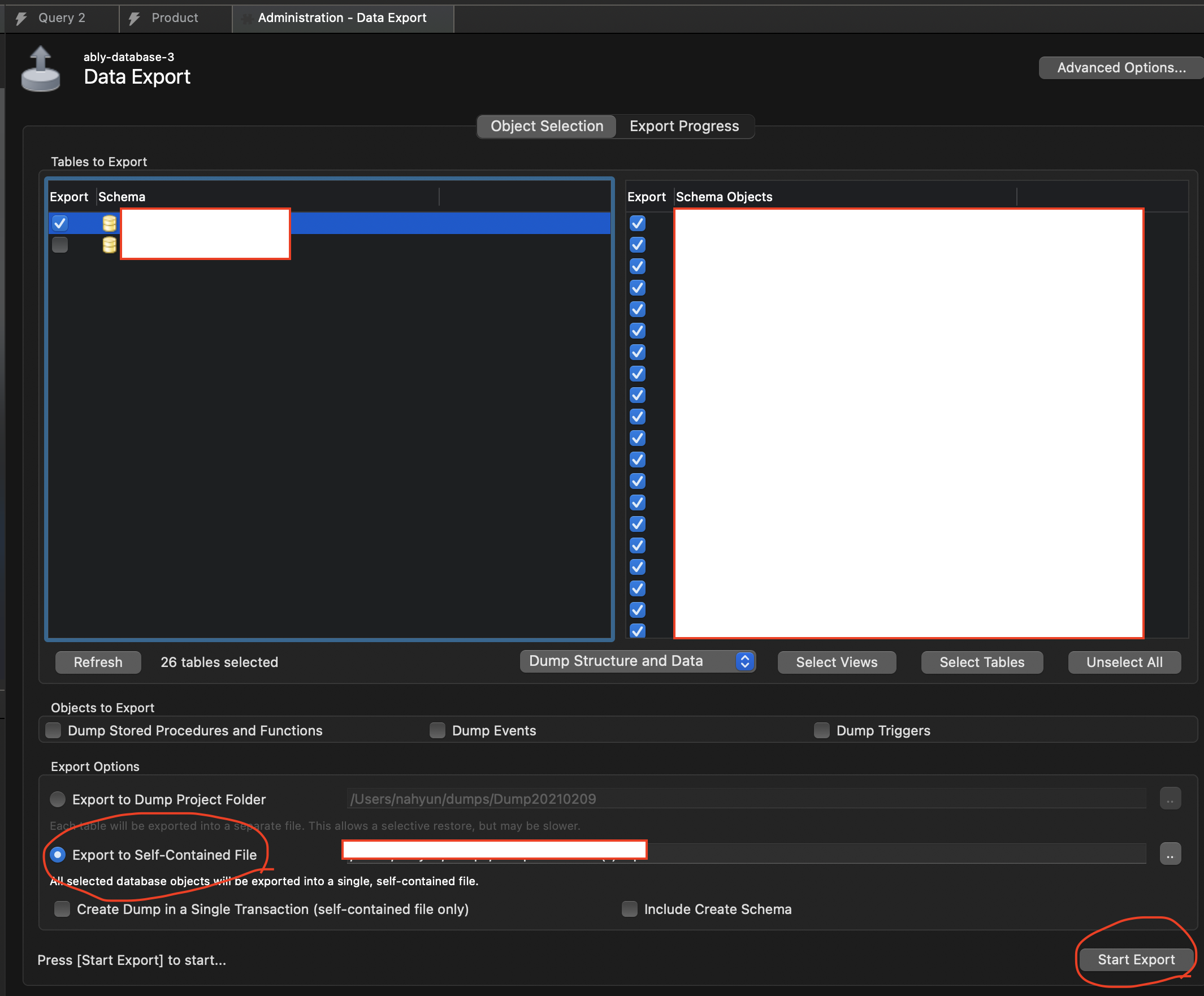 내가 원하는 스키마와 테이블들을 선택하고 파일로 export 시켜준다.
