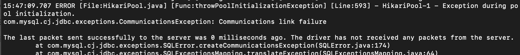 오류를 살펴보니 MySQL connection문제임을 알 수 있다.