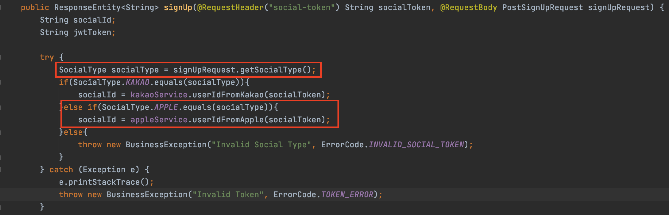 내가 진행하던 프로젝트에는 카카오 로그인이 있었기 때문에 코드가 섞여있지만, 박스친 부분만 확인하면 될 것이다.