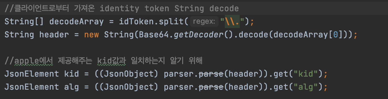 JsonObject의 "kid","alg"를 Element형식으로 뽑아내고, identity token으로 부터 얻은 kid, alg값과 비교한다.