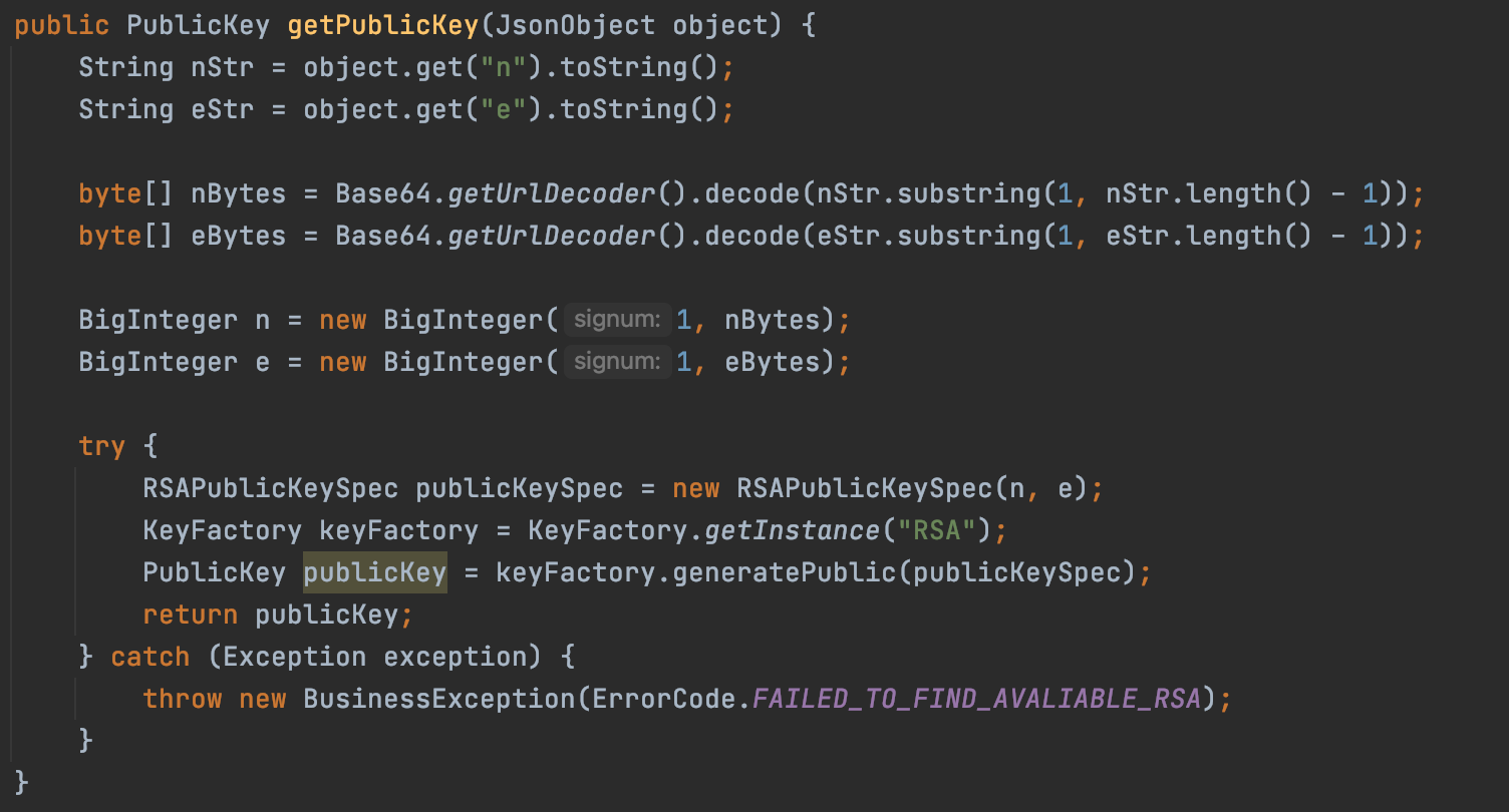 만약 kid, alg가 일치하는 공개키를 찾는다면 이를 avaliableObject를 통해 가지고 나온다.