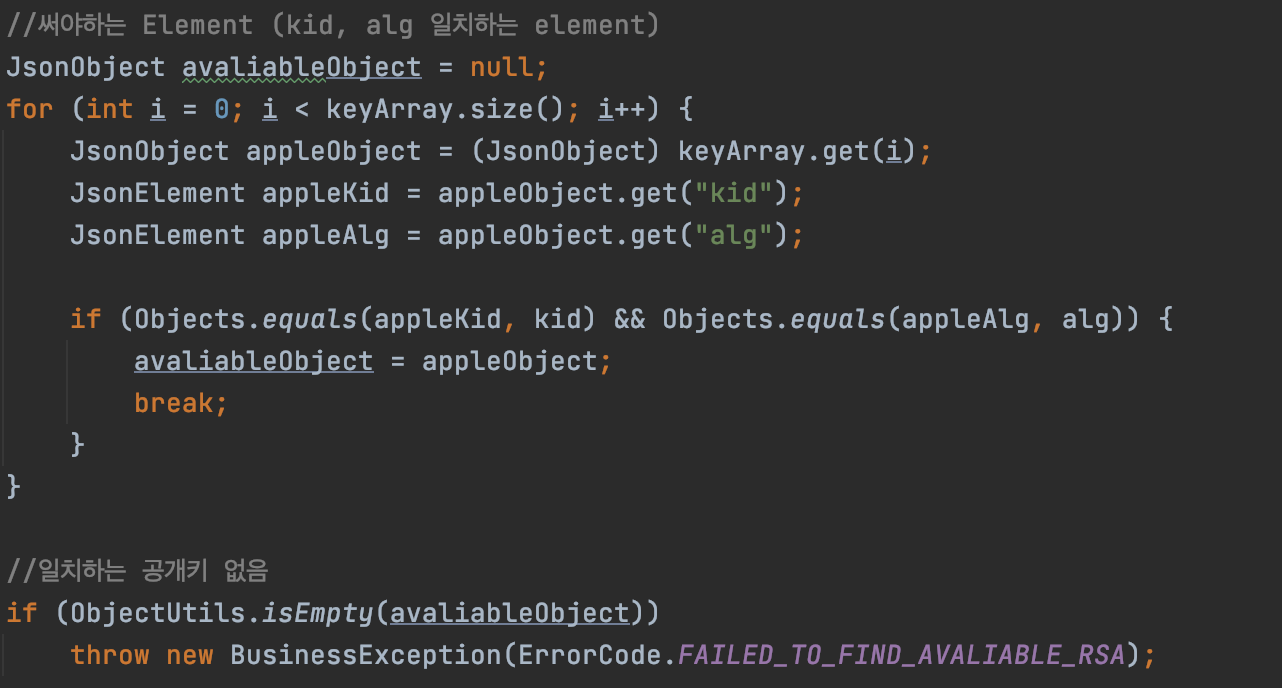 만약 반복문을 다 돌았는데 일치하는 공개키가 없어 avaliableObject가 여전히 null을 띄고 있다면 Exception을 발생시킨다.